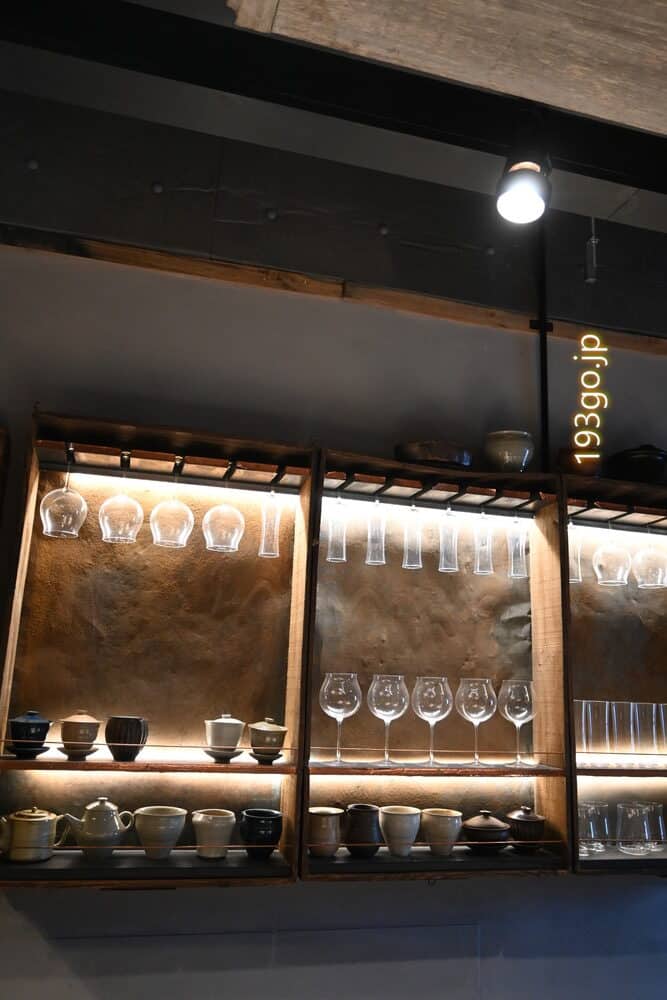 間接灯に照らされたカウンター席に座ると、味のある木棚に陶器が並ぶ。