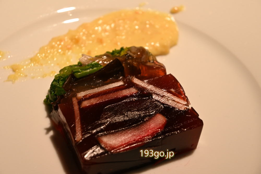 菜の花や椎茸、菊芋、ビーツなどを寒天で固めた、涼しげな彩り。