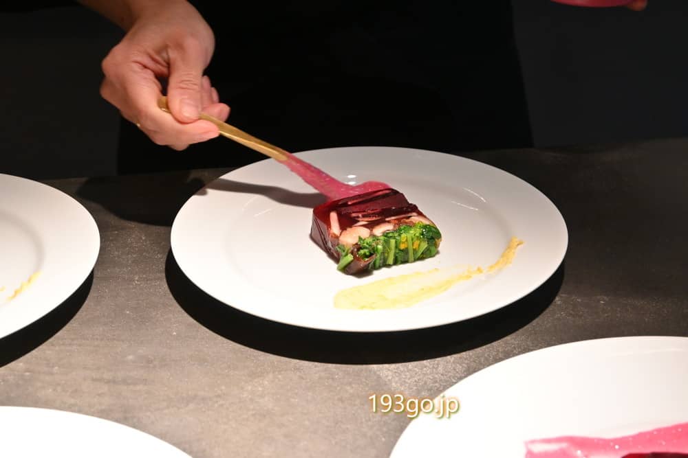 白いお皿に絵具の筆を振るように鮮やかな赤いソースがちりばめられ
