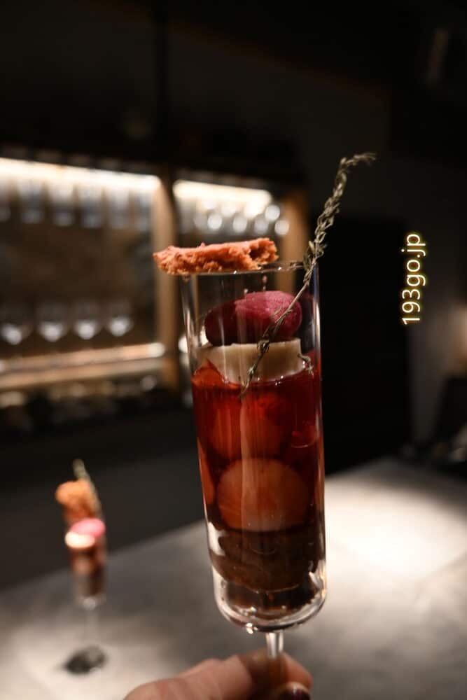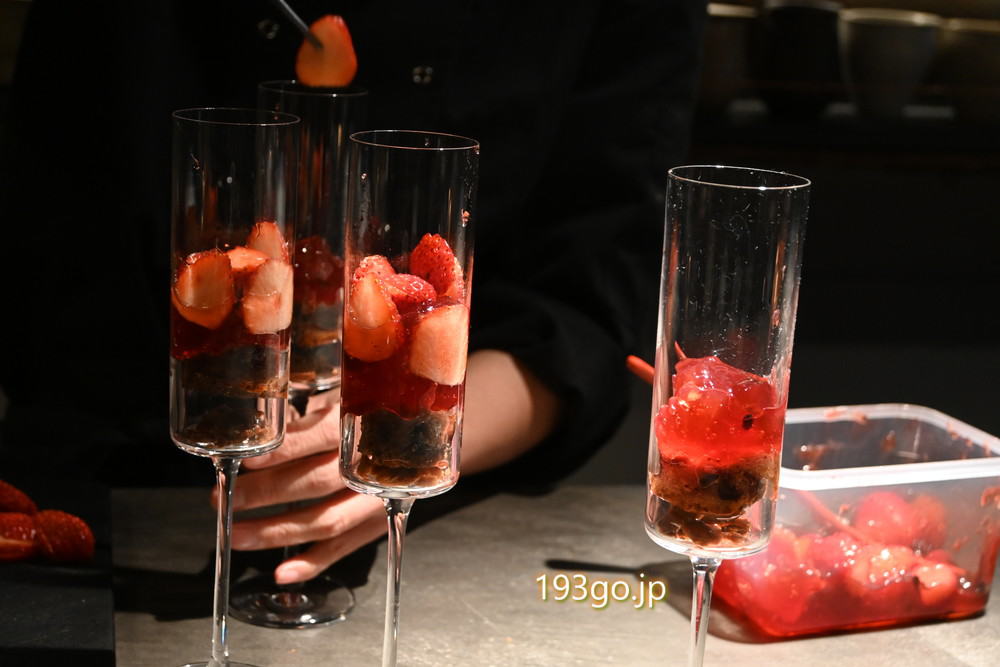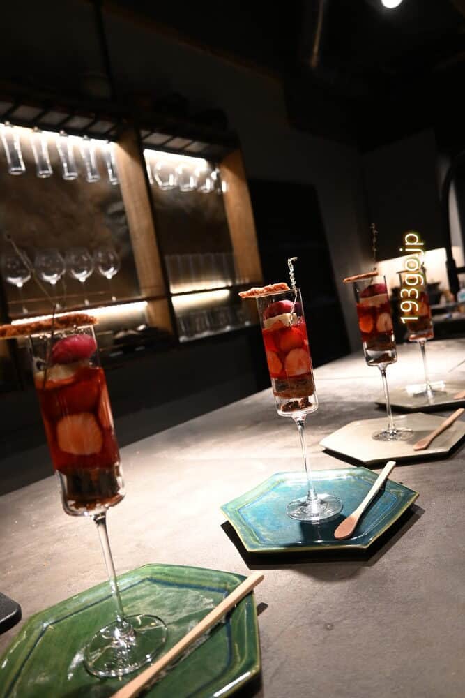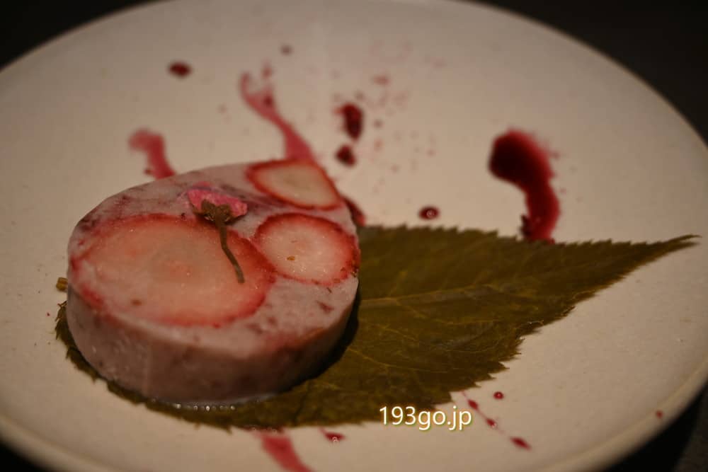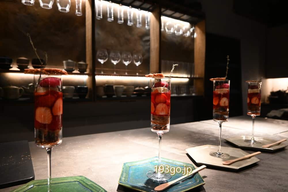 いちご、赤ワインゼリー、ホーリーバジル、求肥、ローズヒップ、黒麹など。