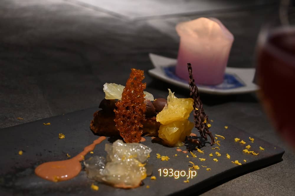 豆乳や醤油麹を使った、ヴィーガンチョコレートにたっぷりの柑橘、砕いたチュイルが飾られる。