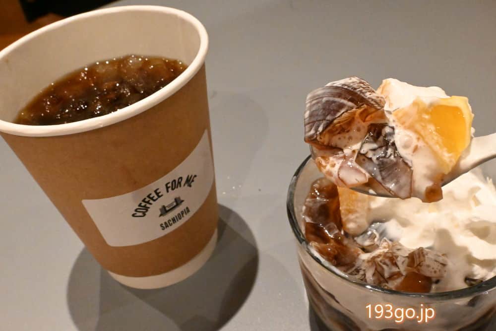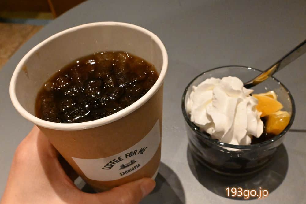 コーヒーゼリーは固めのプルプル食感。冷たくほろ苦いコーヒーゼリーは夏にも食べたくなるスイーツだね。ツルンとした喉越し。オレンジも添えられてる。