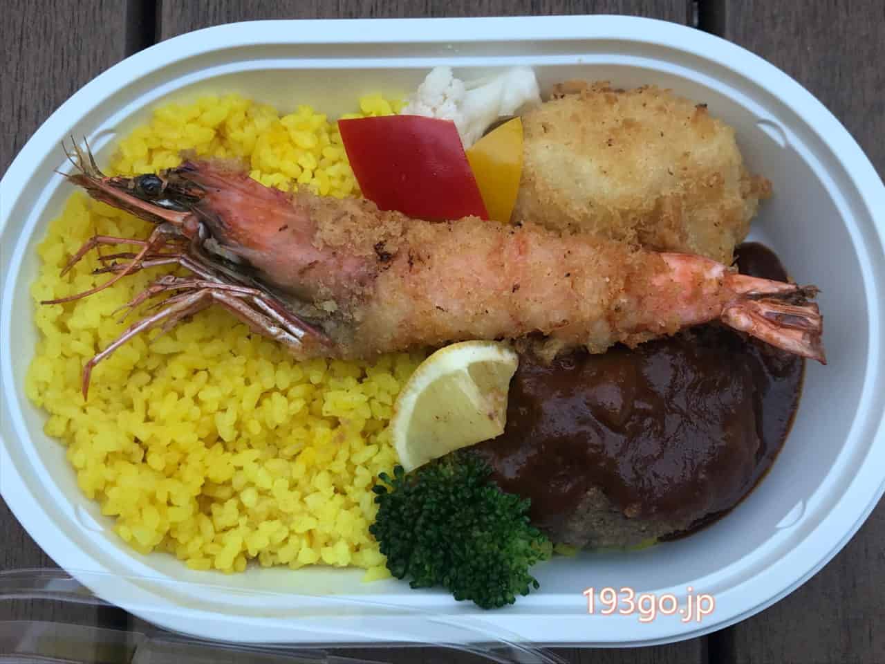 有頭海老のフライとカニクリームコロッケ、ハンバーグ、サフランライスがセットになったもので彩りもキレイ。