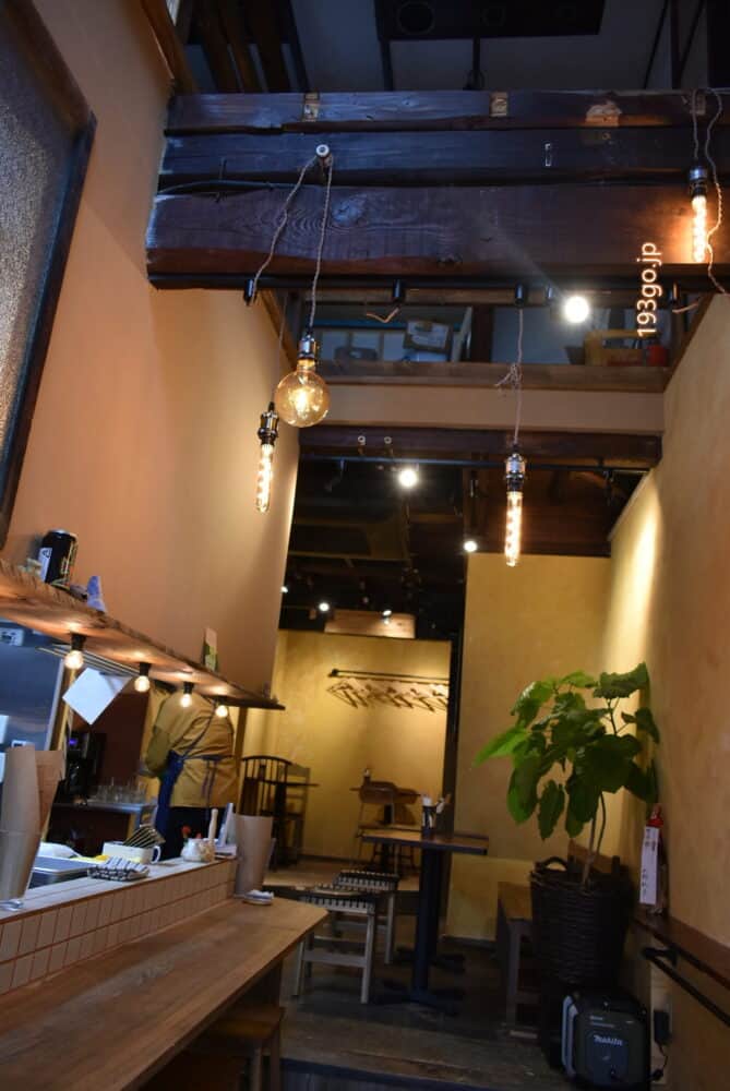 段差を設けた奥行きがある店内は、手前にキッチンとカウンター席、奥にテーブル席。