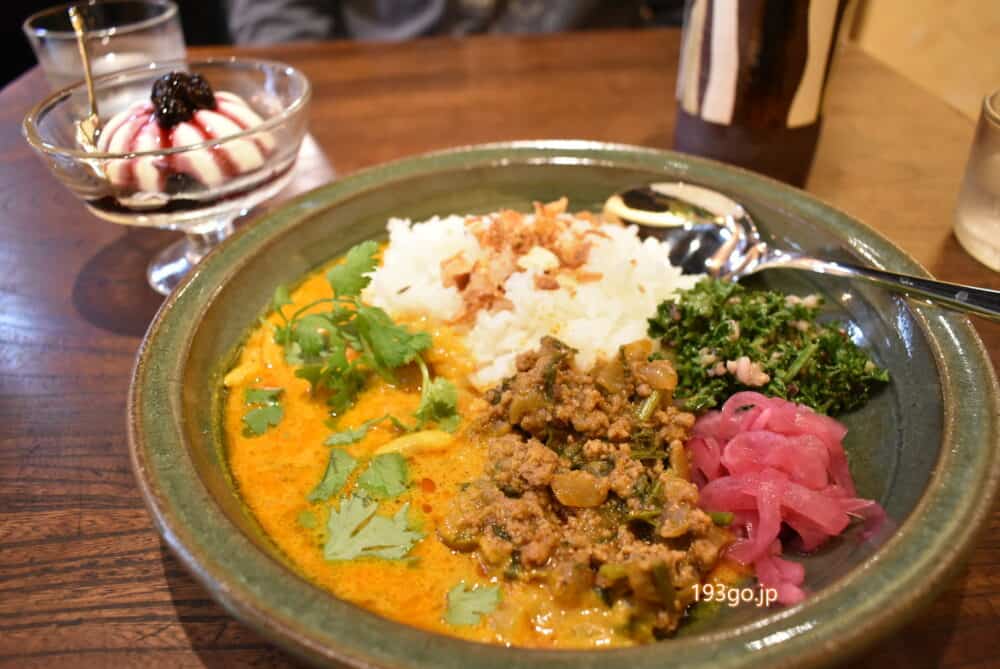(カレートッピング:スパイス味玉150円、パクチー150円、青チリ50円、ご飯大盛り0円)