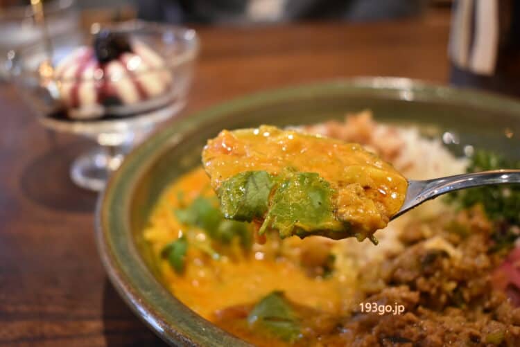チキンカレーはサラッとしていて玉ねぎの甘さにピリ辛がアクセント。パクチーも香る~。