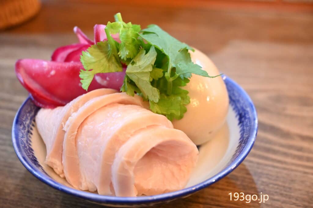 味玉と、しっとりした茹で鶏、赤カブ漬物の盛り合わせ。