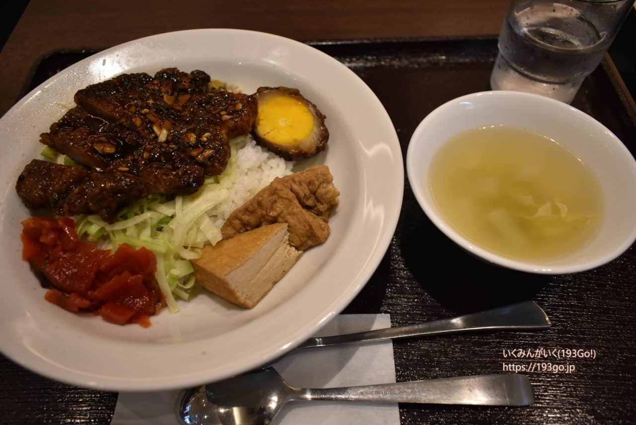 日替わりランチ、肉飯(ルーローハン)、高雄名物焼豚飯、台湾鉄道弁当、台湾風照り焼きチキン弁当、台南名物担仔麺(タンツーメン)など惹かれる文字列が並び、いくみんは未だ食べたことがない「排骨飯(パイクーハン)」に!