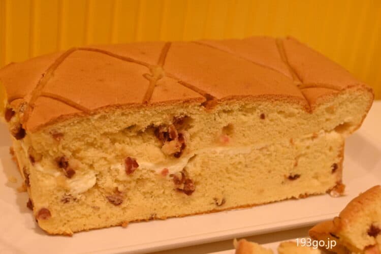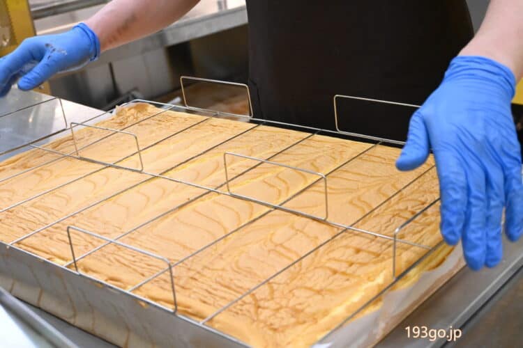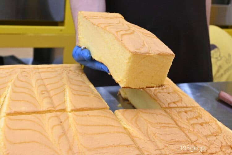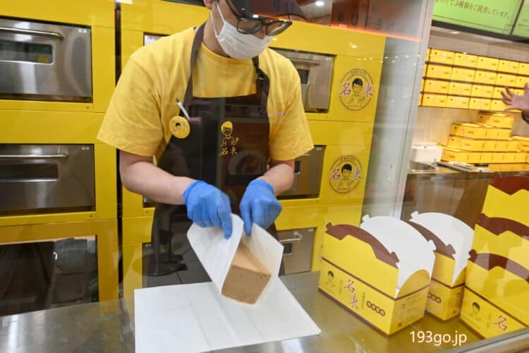 ガラス張りのショーケースでは、巨大な台湾カステラがオーブンから取り出され、均一にカットされ箱詰めにしていくシーンが見られる。