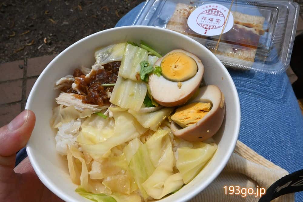 ・日替わり弁当:鶏肉飯(ジーローハン)560円+茶葉で煮た煮卵をトッピング:150円