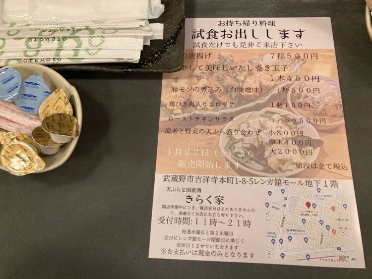 1月末にオープンしたお店で、しばらくはテイクアウトと昼夜共通のメニュー、アルコール提供なしで20:00まで営業を行うそう。