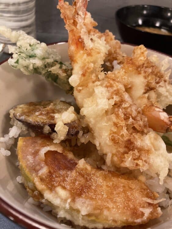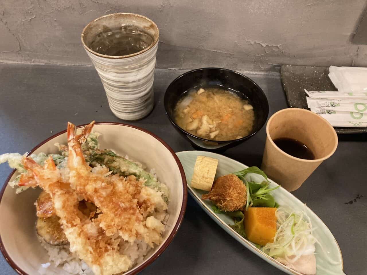 メニューは税込み1,000円でボリューム満点 天丼はサクサク衣&海老が3本