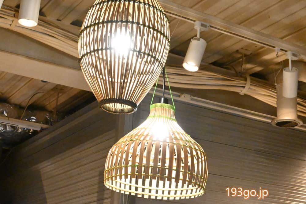 木材のテラスで、照明や雑貨は、網や籠などでアジアンな雰囲気たっぷり。