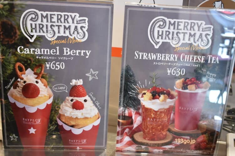 クリスマスメニューはクレープ2種の他、ストロベリーチーズティーのホット、アイスも。各630円