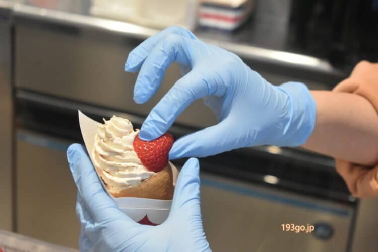 トナカイクレープは、豆乳クリームにキャラメルソースを混ぜ込んだクリームに、フレークのサクサク、中にはラズベリー、フレッシュいちご、トナカイの鼻はいちご、ツノはプレッツェル、耳はアーモンドの、見た目も食感も楽しいクレープ。