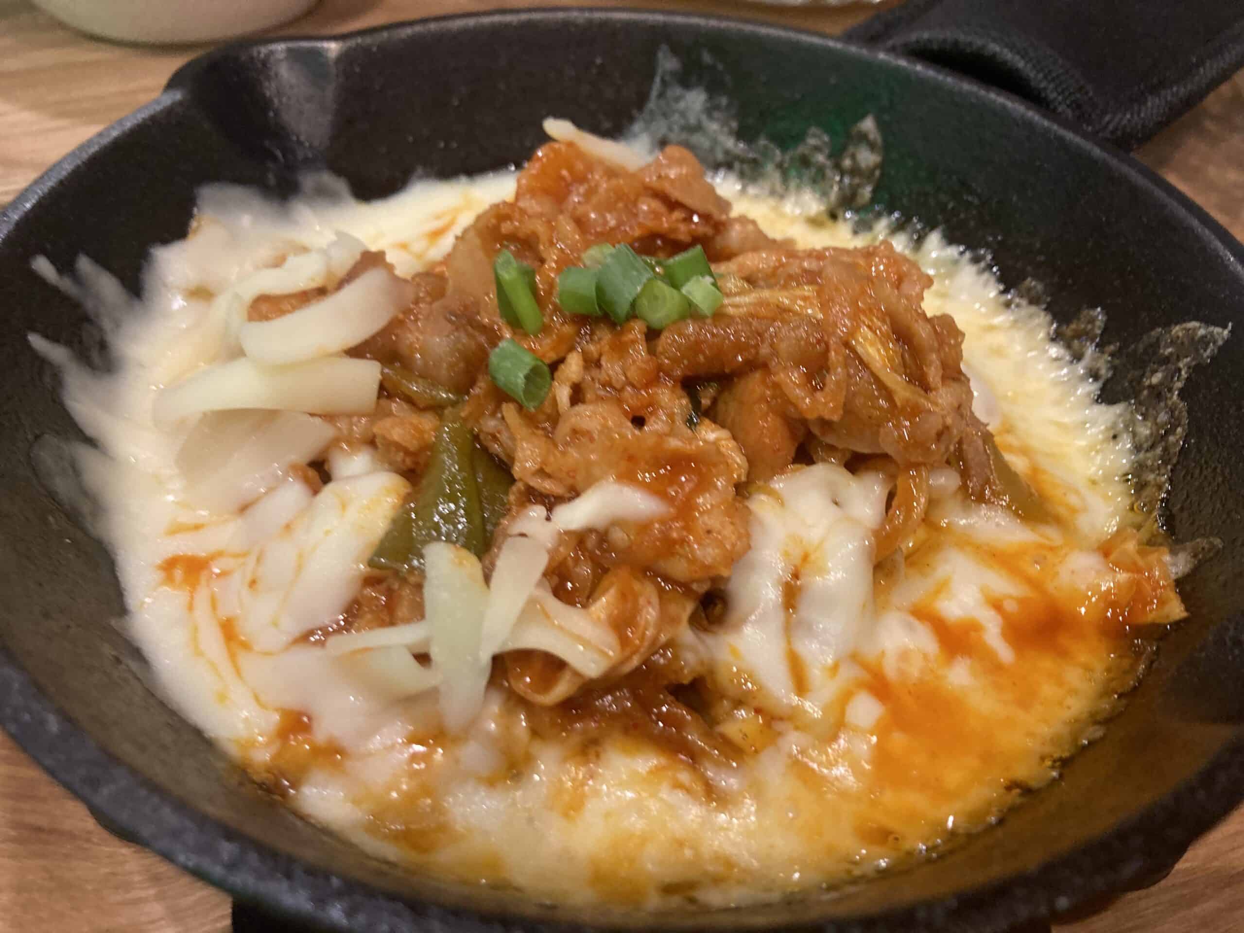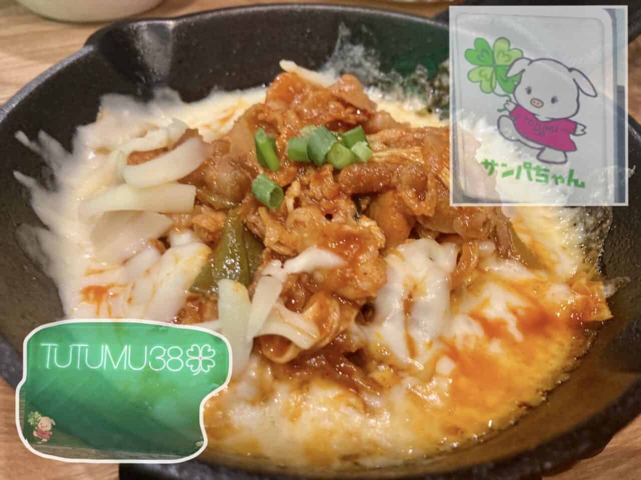 鉄板に熱々のチーズ豚キムチは、コチュジャンの甘い味噌の味付けでチーズたっぷり、ご飯も進む。