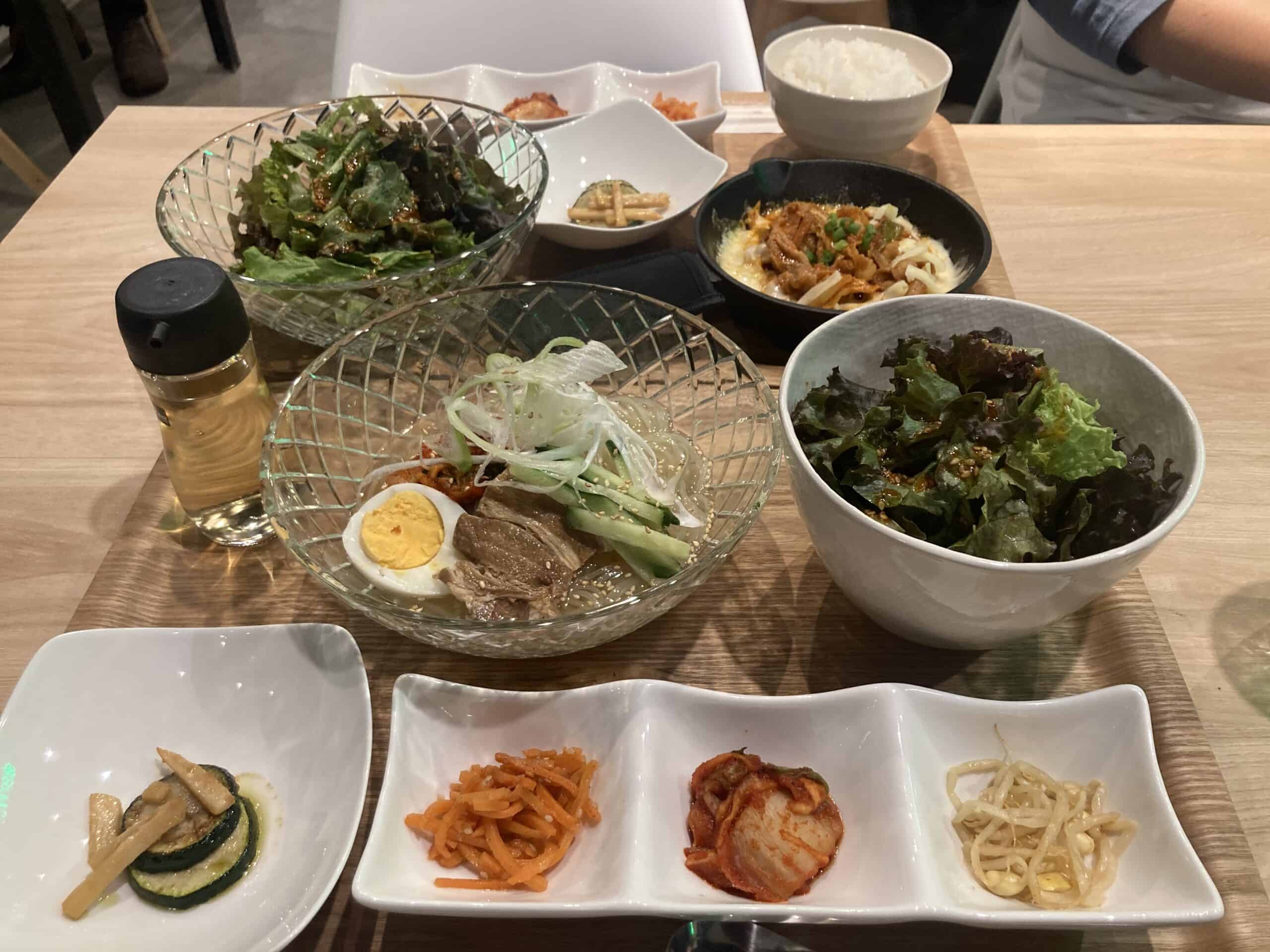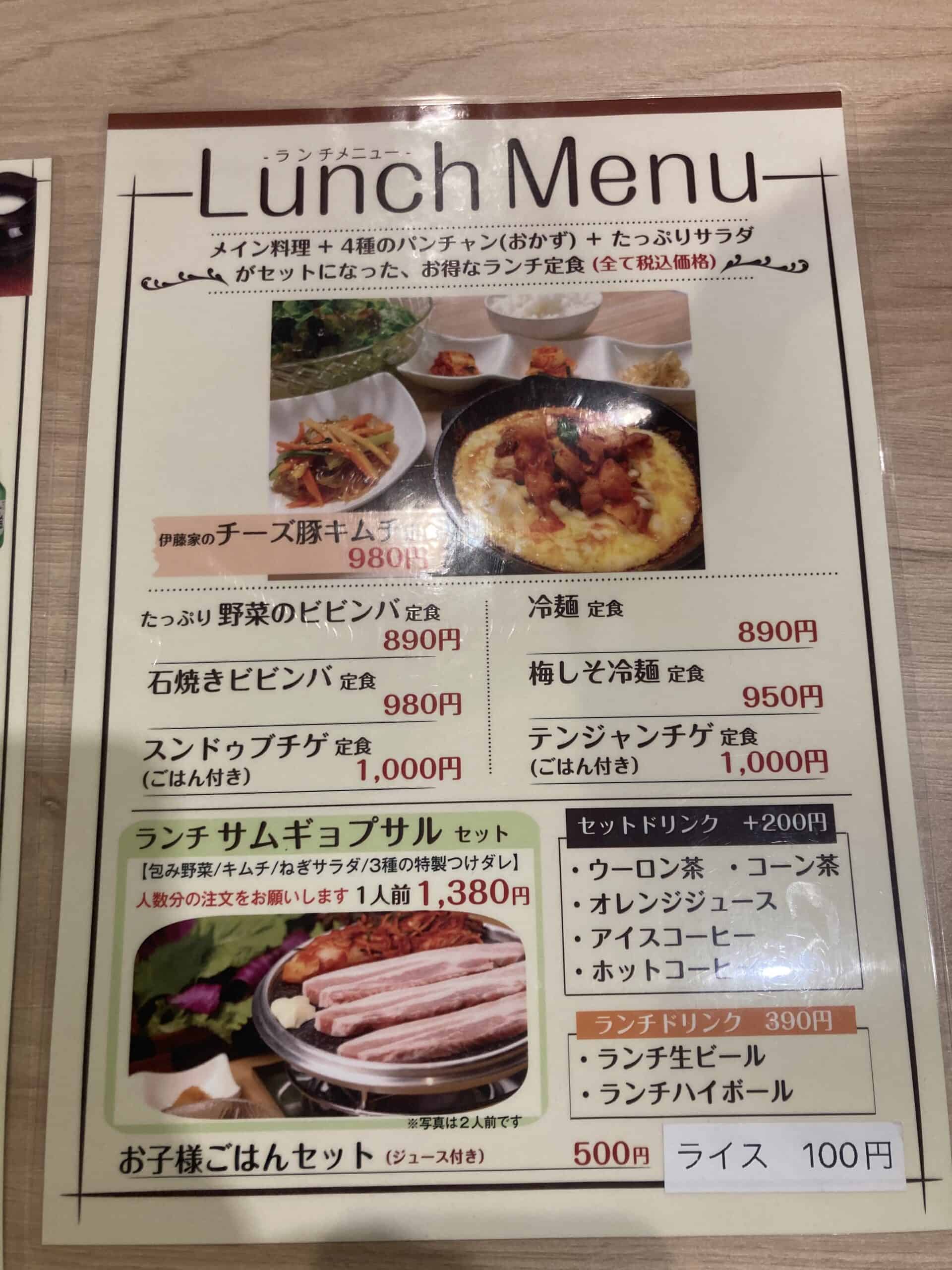 11:30~15:00までのランチはサムギョプサルや石焼ビビンバ、スンドゥブチゲなどの定食メニューが揃い、4種のバンチャン(おかず)とサラダが付いて、税込み890円~とリーズナブル。