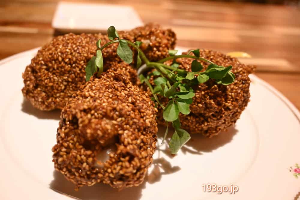 ゴマをたっぷりまぶしたフライドチキンはゴマの香りとカリカリの衣が旨い。