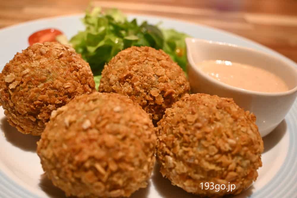 小麦粉の代わりにゴマをまぶしたセサミフライドチキンと、衣にオールミート使ったコロッケ。