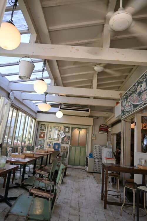 店内へ。白い木組みの建物に、屋根は高くファンが回ってる。ガラス張りで緑がたっぷり差し込む。