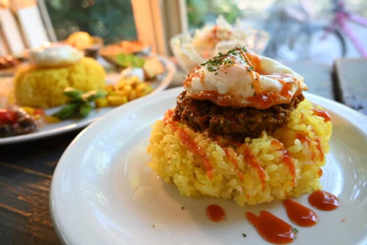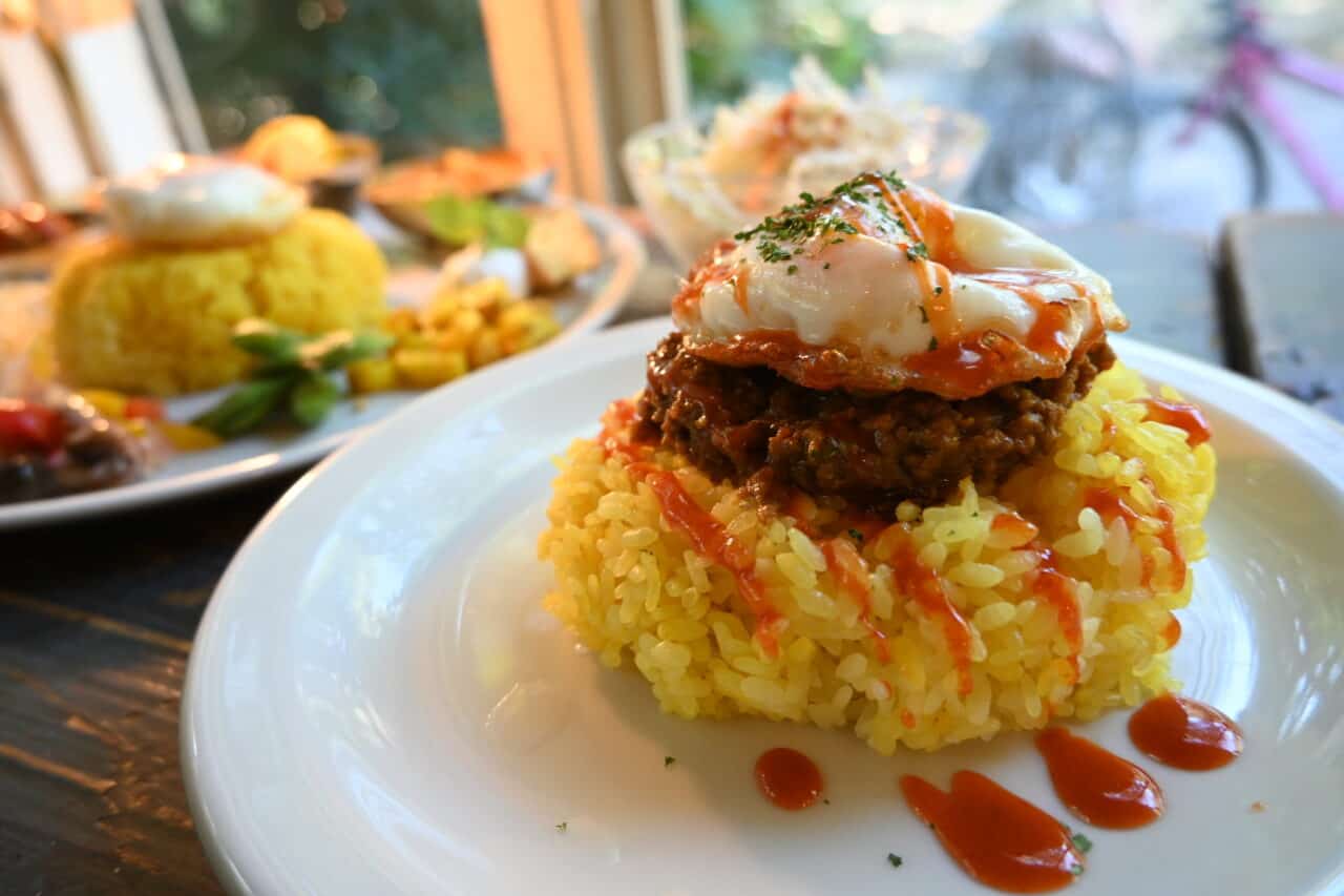 固めに炊き上げられたサフランライス、カレーは甘めで挽肉ゴロゴロのしっかり味、目玉焼きは揚げた感じで外側がカリッとで美味しい。
