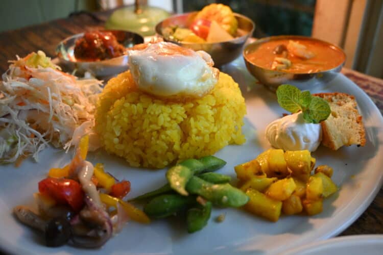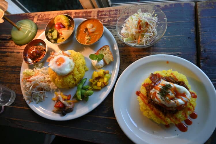 中央にサフランライスと目玉焼き、ドライカレー、野菜カレー、レッドカレーと楽しめる。