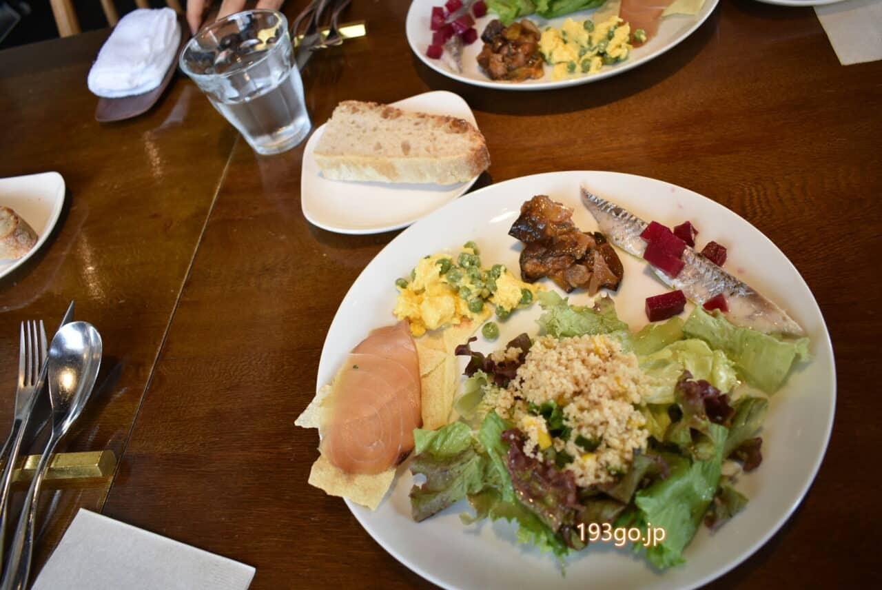 ナスのカポナータ、ビーツ、メカジキの燻製生ハム、グリンピース入りのスクランブルエッグなど…