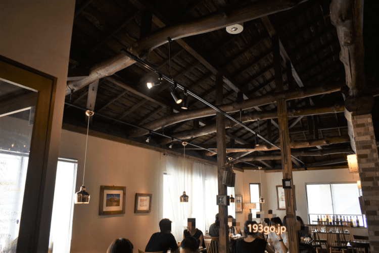 天井が高く三角屋根に木組みでログハウスの様な雰囲気。外からは中の様子が分からないけど、窓もあり光が入り開放感がある。