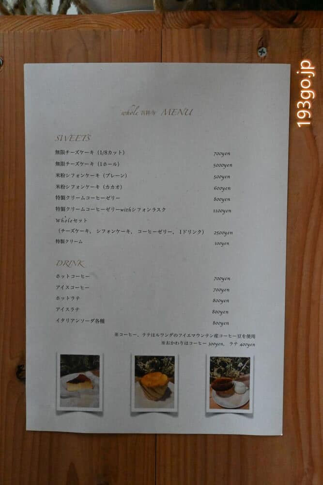「whole(ホール)吉祥寺」メニュー スイーツとドリンク