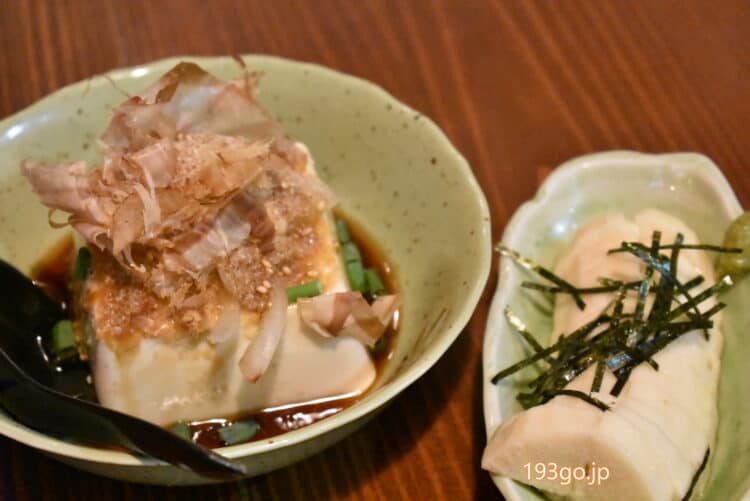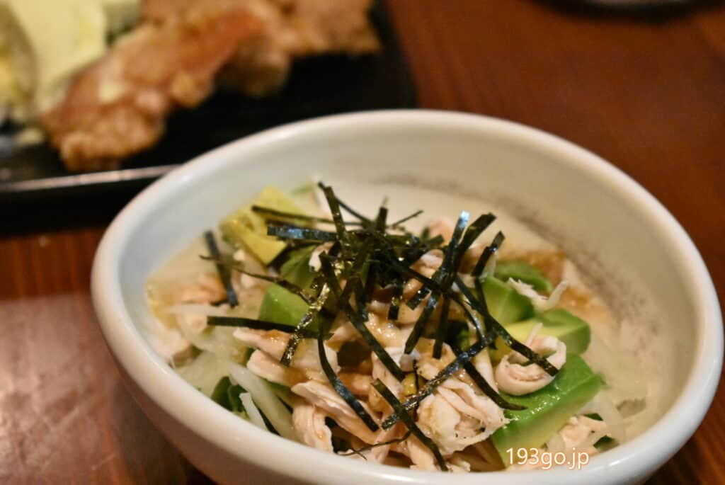 揚げ物の合間に長芋わさび漬けや、ささみとアボカドのわさび醤油和え、生姜たっぷりのった奴(冷ややっこ)などのサッパリしたおつまみ。