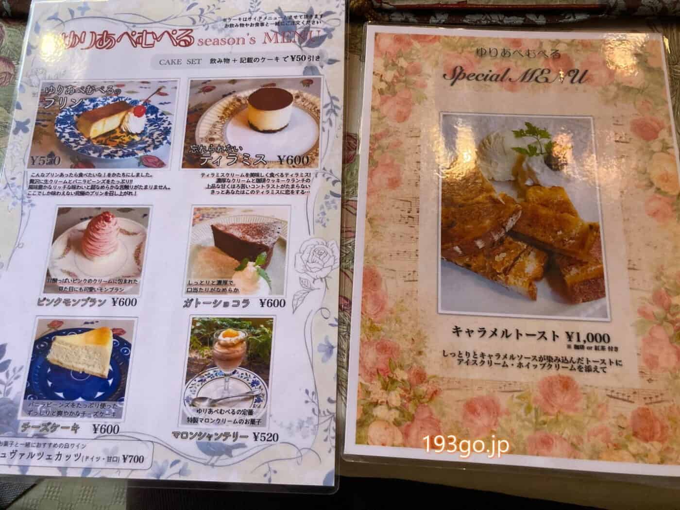 デザートはゆりあぺむぺるのプリン、忘れられないティラミス、ピンクモンブラン、チーズケーキにガトーショコラ、ゆりあぺむぺるの定番マロンシャンティ―…とあり、