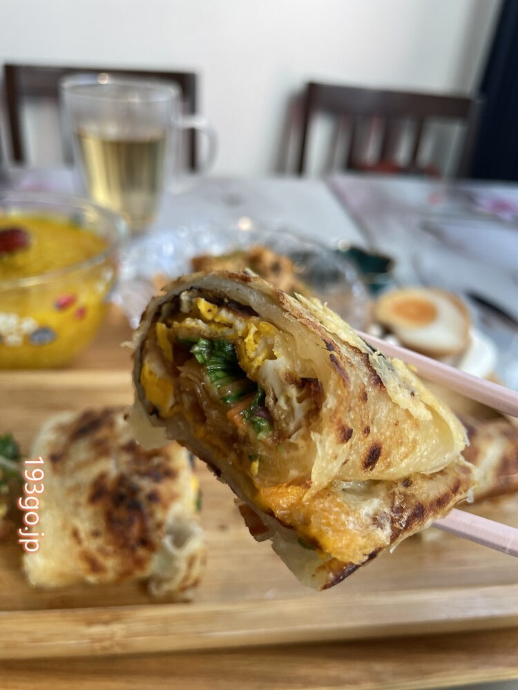 葱を練り込んだパリパリでモチっとした生地に、ポークハムや目玉焼き、野菜が巻かれてる。春巻きみたいな感じ。具沢山でボリューミー!