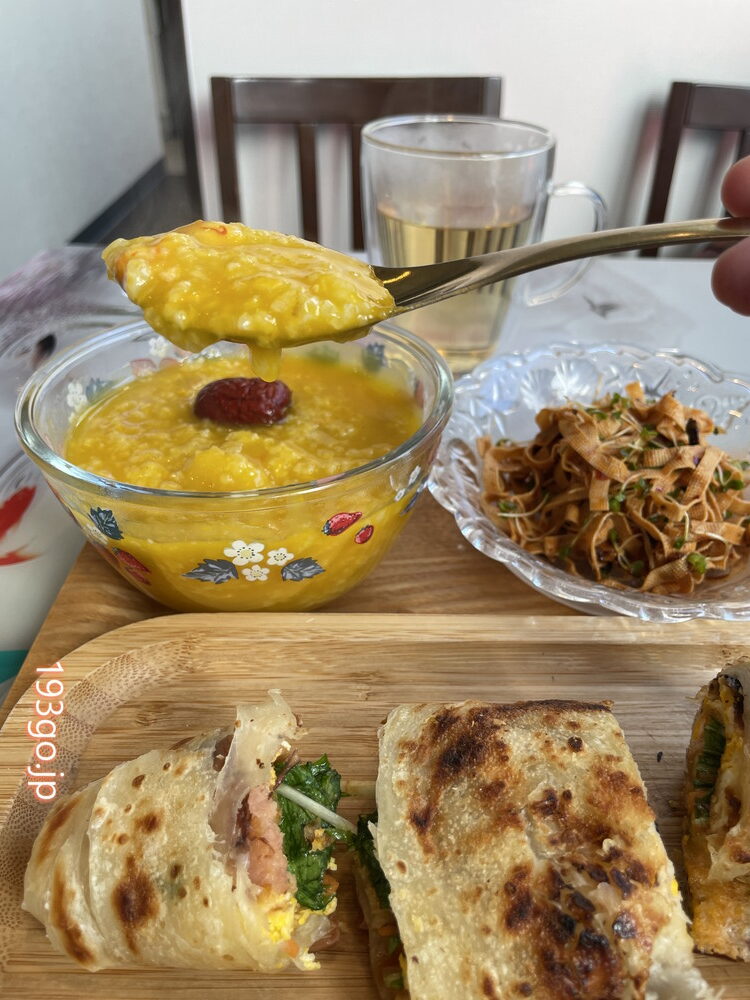 この日のお粥は色鮮やかな黄色。カボチャと里芋入り。ナツメとクコの実が浮かんでる。ナツメも丸ごと食べられる、ほんのり甘くておいしいね。