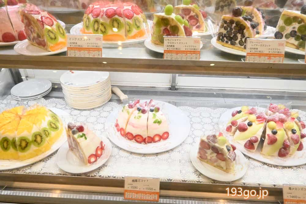 店頭ショーケースにはフルーツがモリモリのケーキ「ズコット」