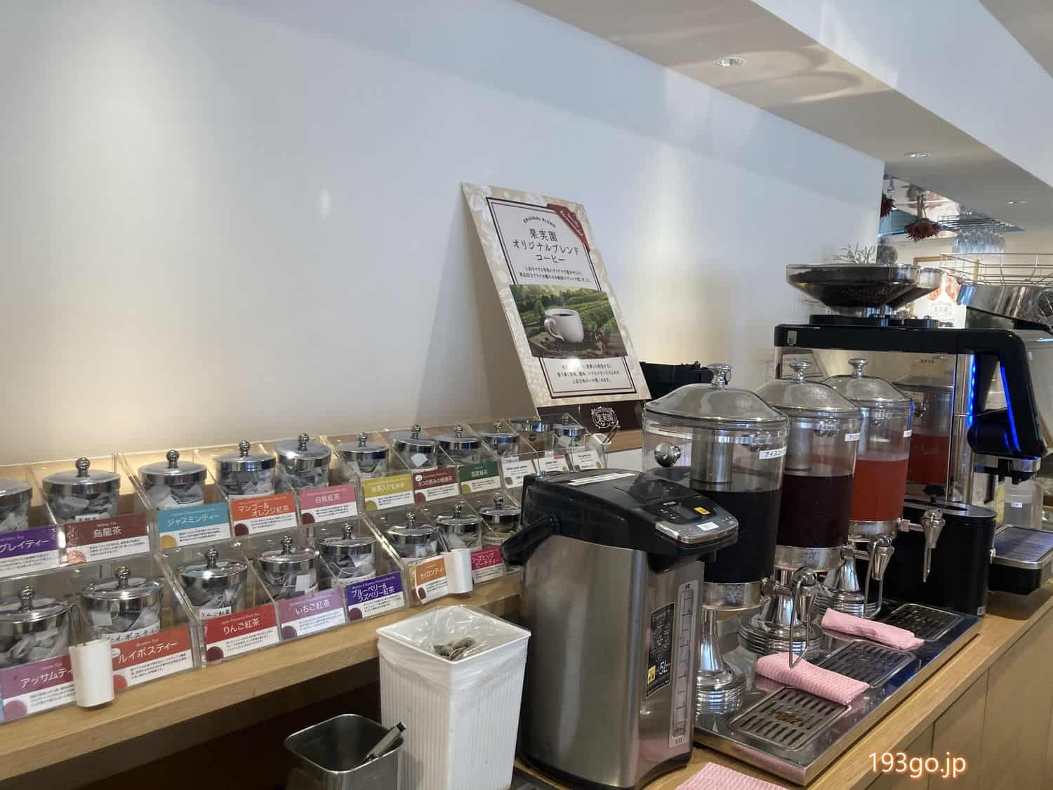 ティーバッグが多種類。コーヒーは果実園オリジナルブレンドだ。