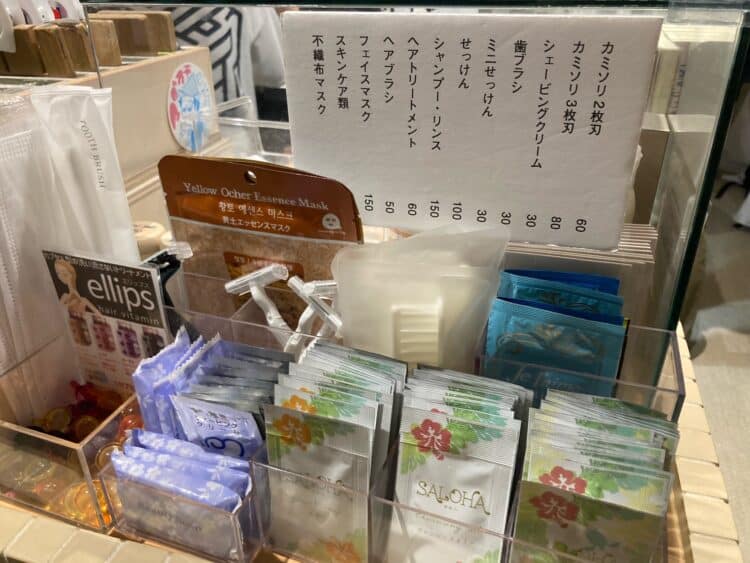 その他、シャンプー・リンス、ヘアブラシ、フェイスマスク、スキンケア類、歯ブラシなど使い切りがフロントで売られてる。