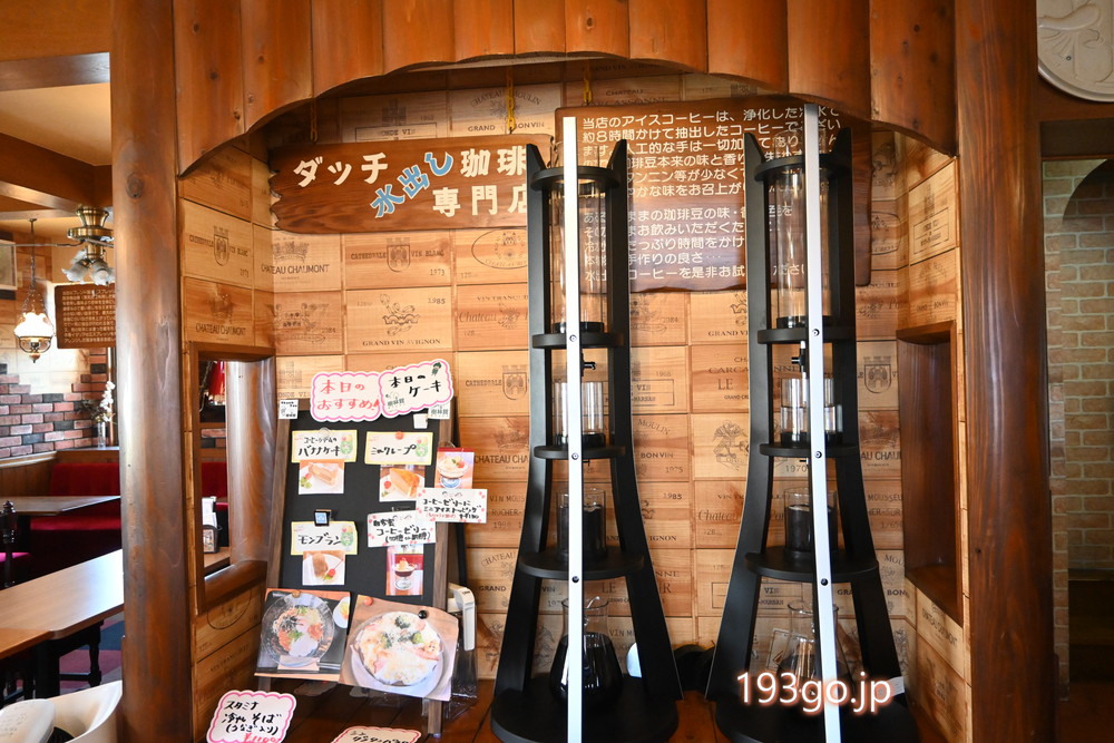 水で抽出するこだわりのダッチコーヒーや、コーヒーゼリー、モンブラン、ミルクレープなどの自家製ケーキに、食事メニューも充実。