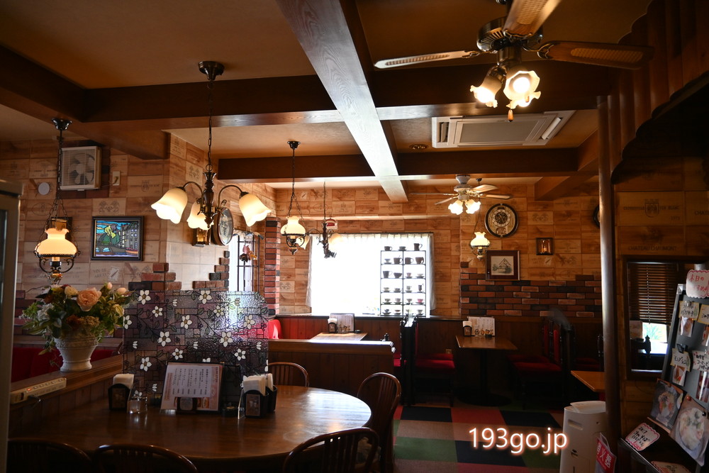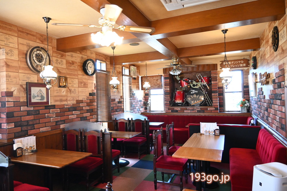 ログハウスを思わせる雰囲気で、レンガや木材、ステンドグラスを用いたレトロで高級感のある内装。見渡すと古時計やユニークな照明で彩られ、ファンが回り、赤いベロアのソファーが置かれてる。