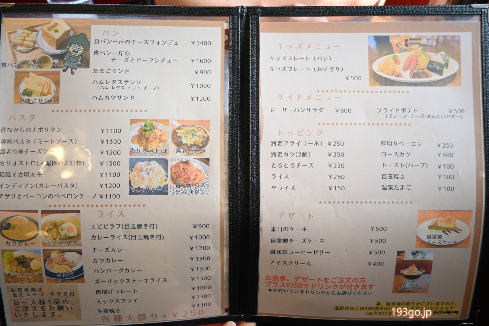 グランドメニューには、食パン一斤のチーズフォンデュやサンドイッチ、ナポリタン、エビピラフにハンバーグカレー、ガーリックステーキライス…