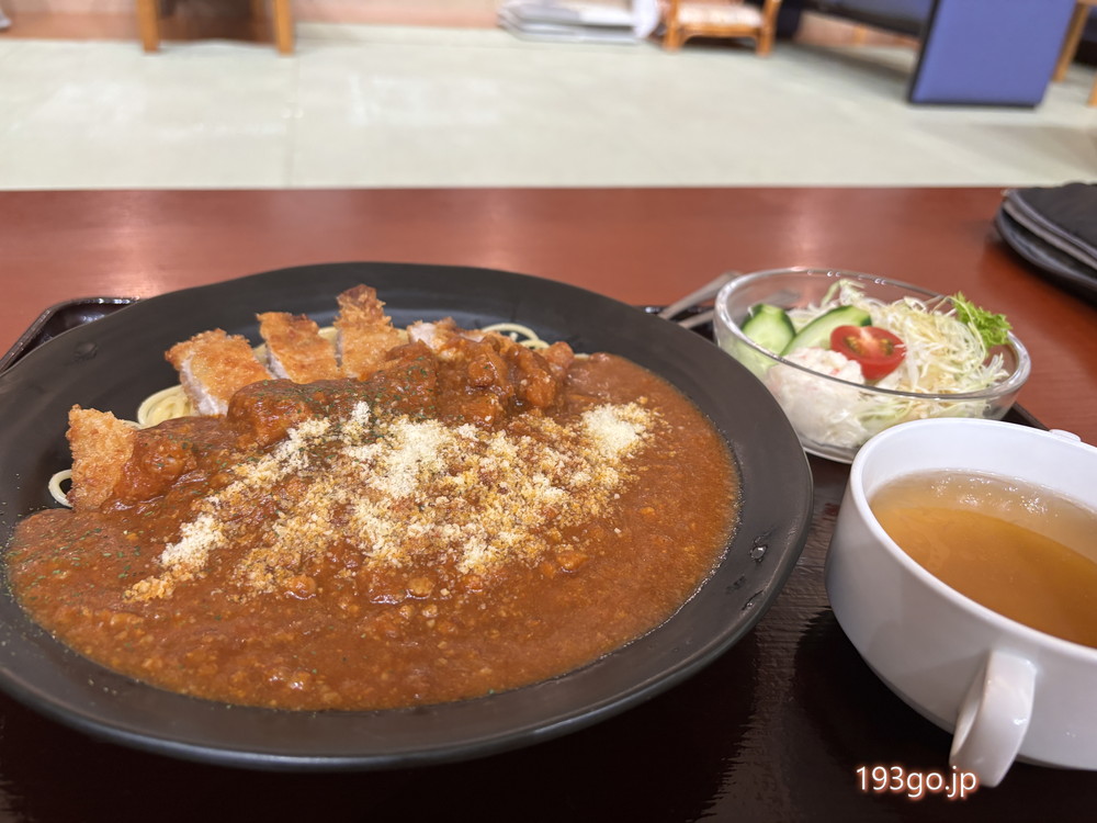 を頼んだら、スパゲティの上にミートソースととんかつが乗ったボリューム満点の一皿。好みの味で完食~。