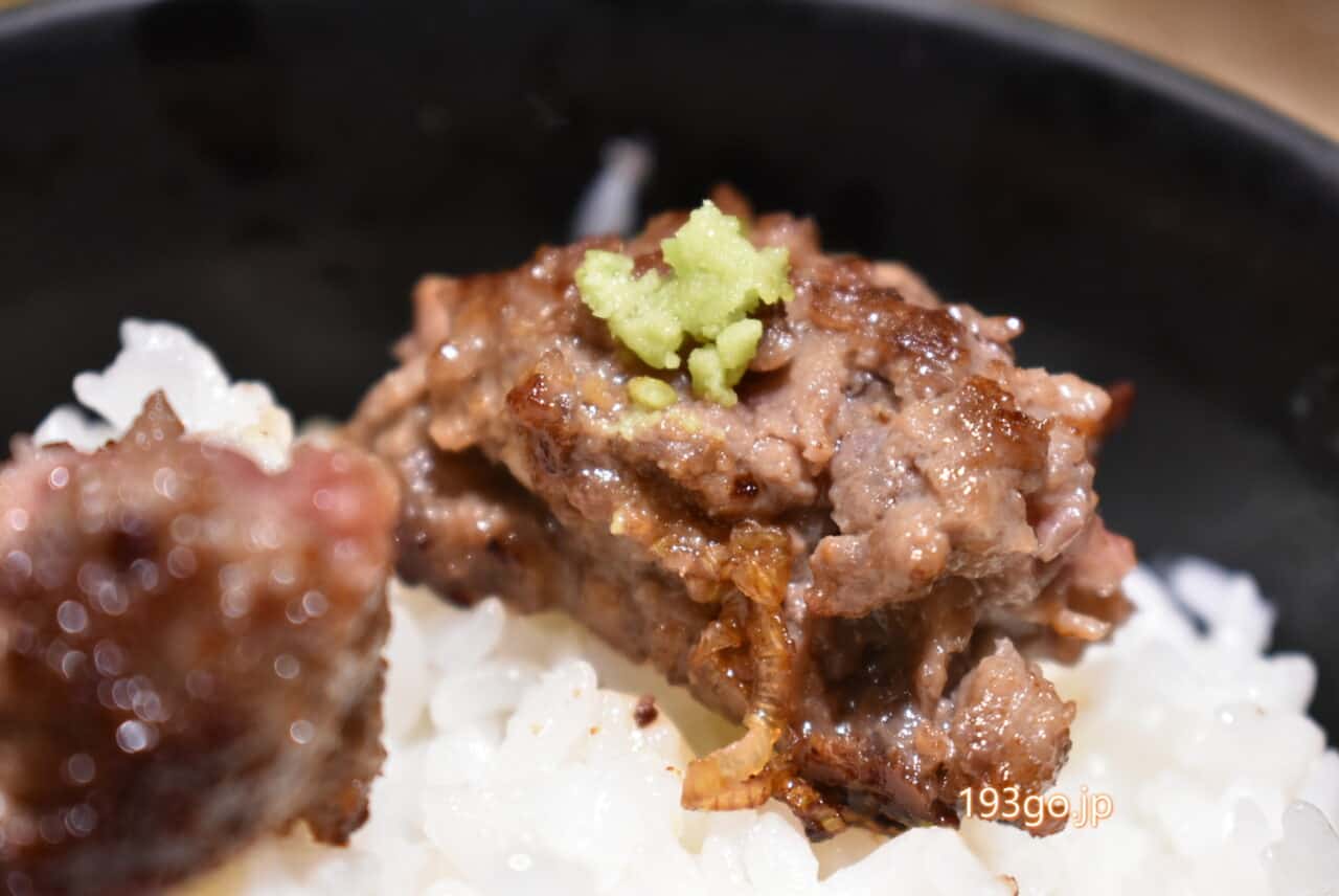 まずは、表面のみを焼き上げたハンバーグを、カウンターの鉄板で一口ずつ焼き上げながら食べるスタイルだ。一口分ずつ焼き加減を変えられるのが楽しいパンバーグ。