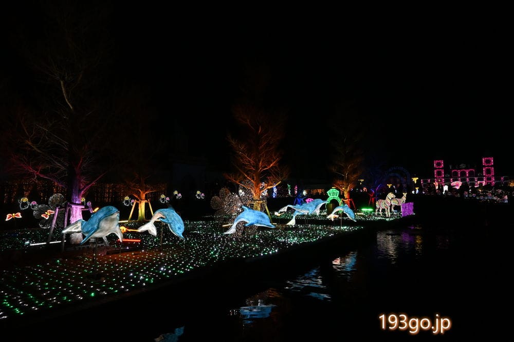 水辺の演出や、ハートのアーチ、お花畑、イルカ、KOBE…見ごたえがあった。