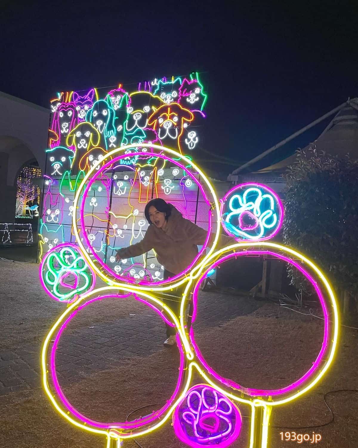 日本初ワンちゃん用のイルミネーションエリアには、ワンちゃんたちも楽しめる、輪っかやハードルなどの遊具や、ワンちゃんと一緒に楽しめるフォトスポットも。