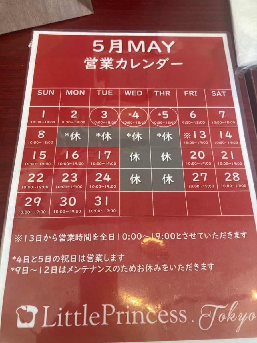5月の営業:水木定休(GWの4、5日は営業)5月9日~12日休業。営業時間:10:00~18:00、13日以降は全日10:00~19:00