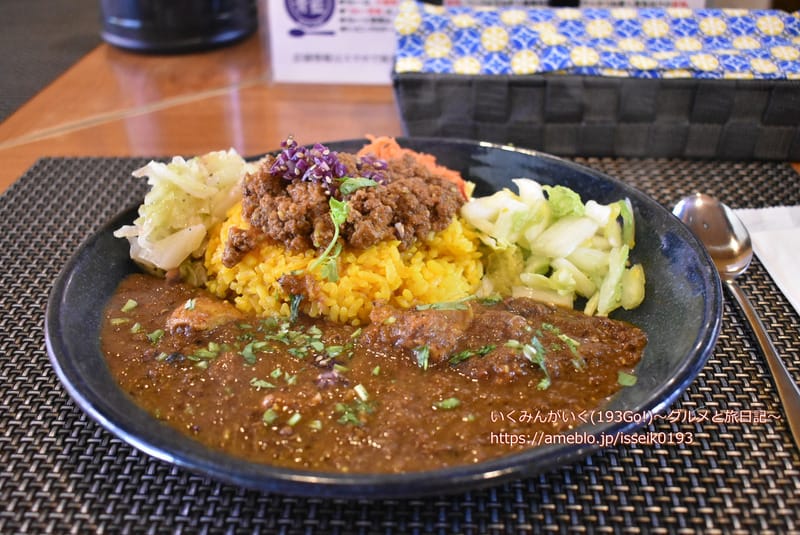 ターメリックライスに、スパイス効いたカレーがたっぷりかかっている。