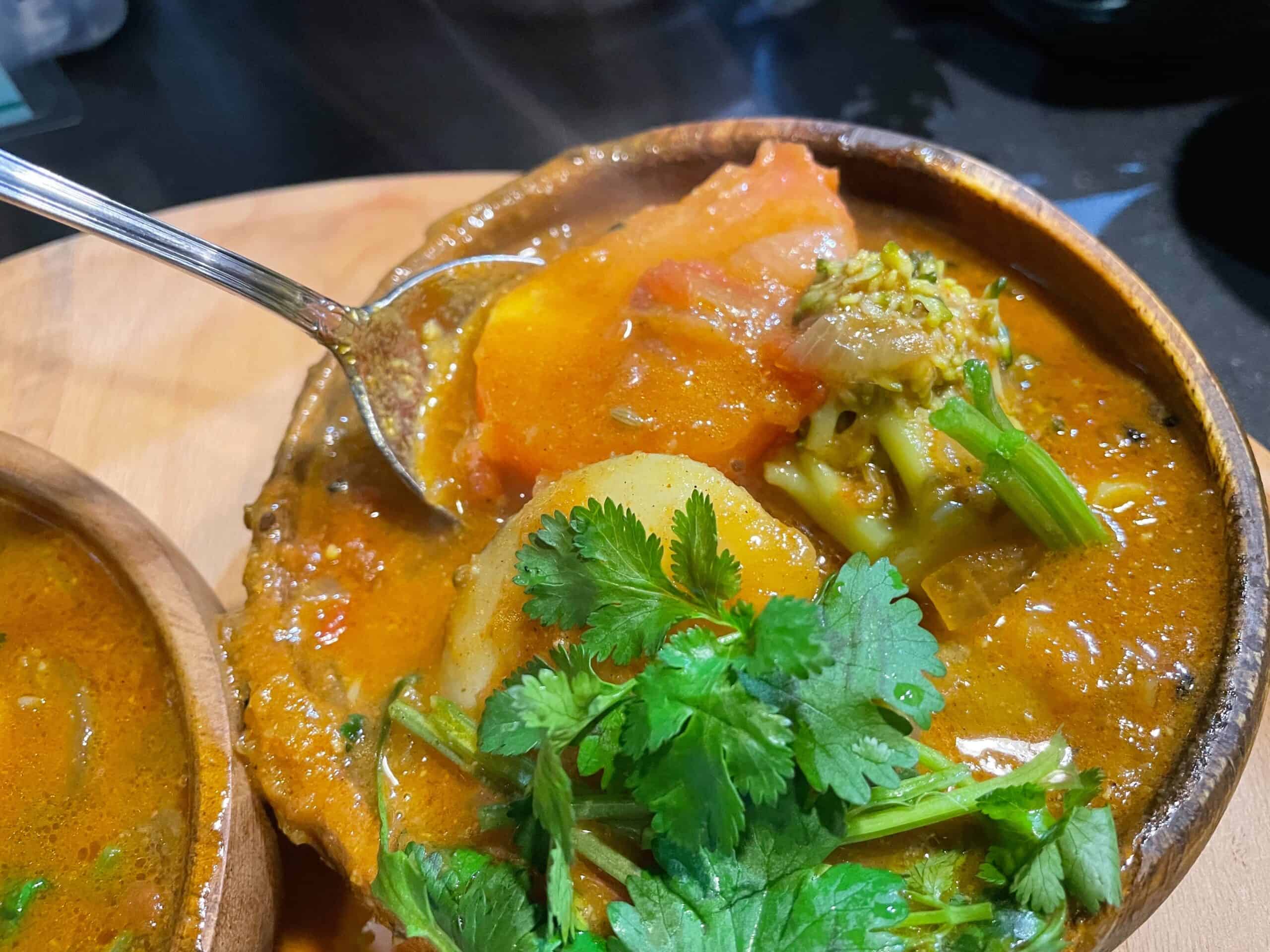 野菜カレー:ブロッコリー、トマト、ジャガイモ
