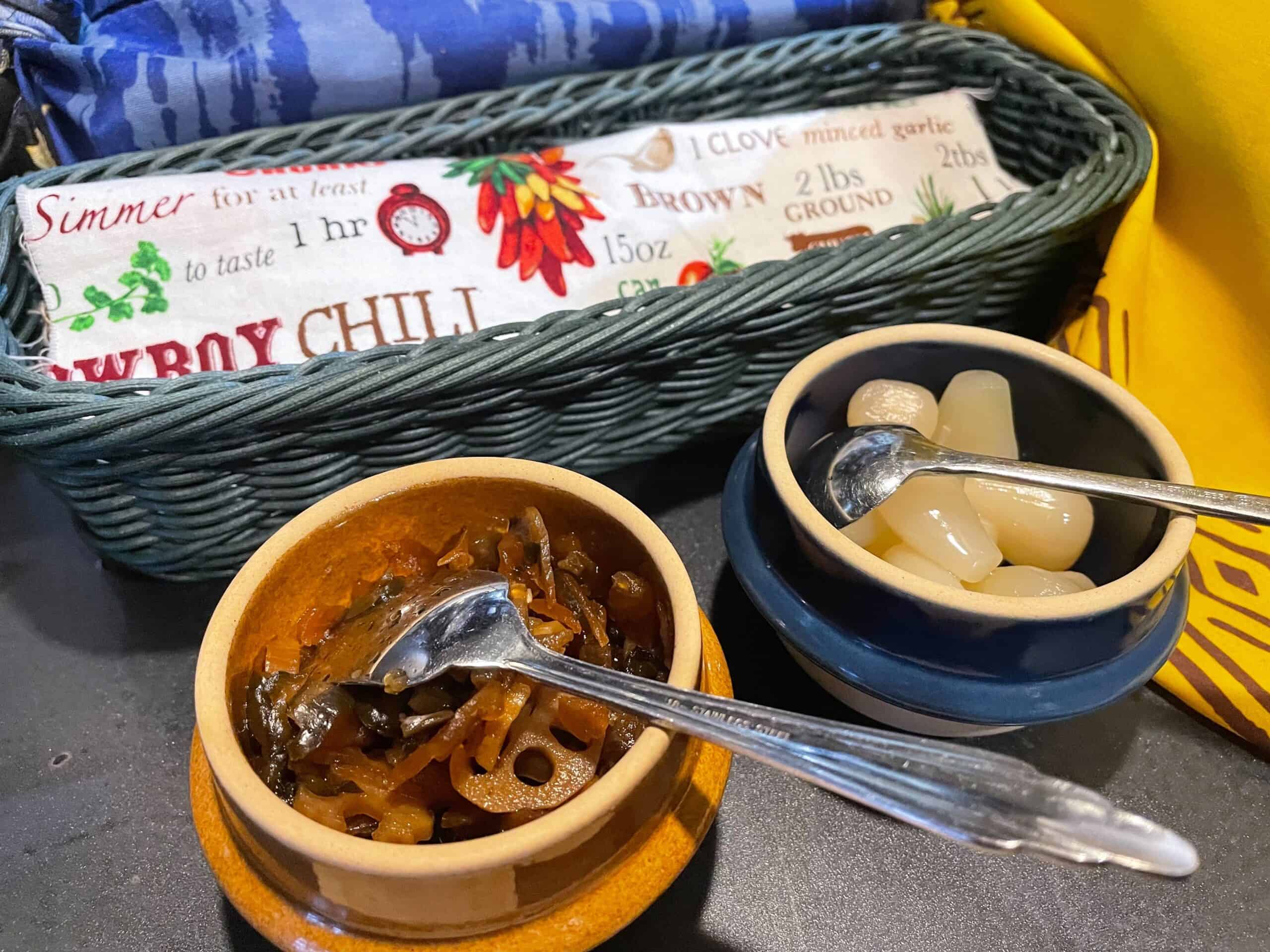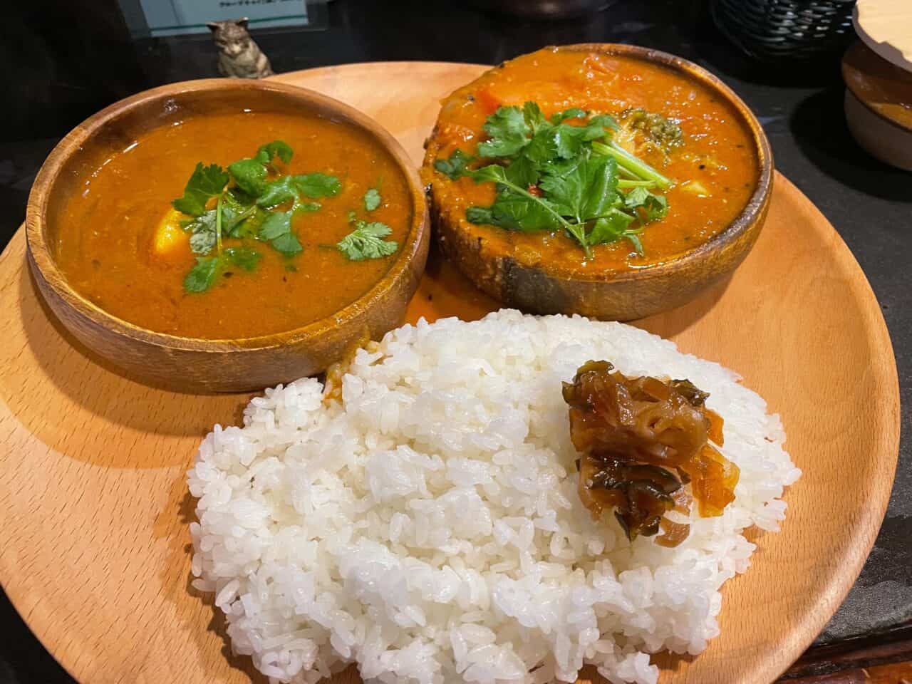 器になみなみ2種盛り!スパイス効いた野菜カレーと旨みたっぷり鰤カレー