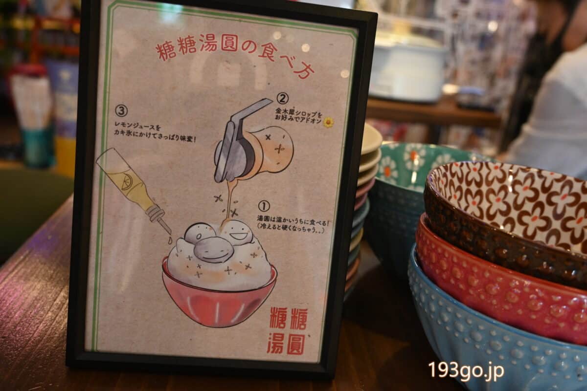 氷を削り金木犀のシロップをかけ、茹でたてのタンユェンを乗せてくれる。丸く真っ白のカキ氷の上に湯気が立ったタンユェンが3つ。