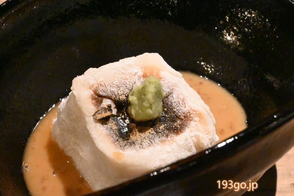 お通しの焼き胡麻豆腐。サラマンダーで火を通した、焼き目の付いた胡麻豆腐は初め。