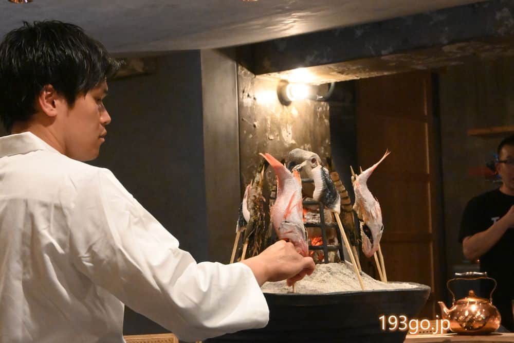 メイン料理は、鮮魚や野菜を囲炉裏端でじっくりと串焼きにする日本の伝統的な調理法「原始焼き」